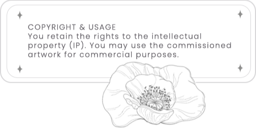 ✦ If you wish for me to change something in the drawing you have previously approved, I will charge you a fee to change it. The amount of the extra charge depends on the change you want me to make and is usually based on an hourly wage.5. COPYRIGHT & USAGE